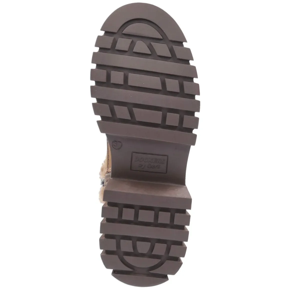 Die braunen Dockers Stiefeletten vereinen urbane Modernität mit funktionalem Komfort. Ein robustes Obermaterial aus Synthetik sorgt für eine pflegeleichte Oberfläche, während warmes Fleecefutter mit Teddyplüsch-Details angenehme Wärme an kühlen Tagen schenkt. Der rund zulaufende Leisten und die textile Decksohle bieten bequemen Halt. Schnürsenkel und seitlicher Reißverschluss erleichtern das An- und Ausziehen, unterstützt von einer praktischen Anziehlasche. Der 6 cm hohe Blockabsatz harmoniert mit der rutschfesten Profilsohle, deren vorderes Plateau von ca. 3 cm sicheren Stand und eine moderne Silhouette begünstigt. Ein verstärkter Fersenbereich erhöht die Stabilität im Alltag. Modetipp: Besonders stimmig wirkt das Modell zu geraden Jeans in Dunkelblau und einem Wollmantel in Camel; dazu ein Strickpullover in Creme, um die warmen Braunnuancen elegant aufzugreifen.