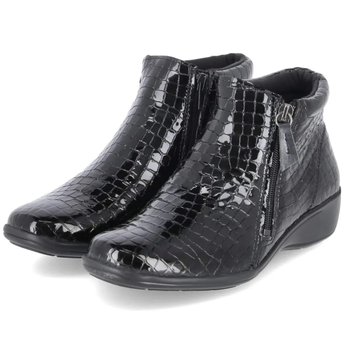 Beliana präsentiert mit den Stiefeletten LEXI 99 einen eleganten Allrounder für Damen, der den urbanen Look mit Komfort verbindet. Das Obermaterial aus schwarzem Lackleder zeigt eine edle Glanzoptik, die durch das dezente Reptilmuster modern akzentuiert wird. Eine runde Schuhspitze und das geringe Gewicht sorgen für angenehmes Tragegefühl im Alltag. Praktische Reißverschlüsse erleichtern den Einstieg, der zusätzlich weich gepolstert ist. Die verstärkte Ferse bietet Stabilität, während die sehr flexible, rutschfeste Laufsohle sicheren Halt gibt. Innen punktet eine textile Decksohle und ein herausnehmbares Wechselfußbett, ideal für eigene Einlagen. Der Schnitt fällt größengetreu aus und richtet sich an Erwachsene, die Wert auf Stil und Funktion legen. Modetipp: Mit schmaler Anzughose in Cropped-Länge und einem feinen Strickrolli entsteht ein cleaner, glänzender City-Look, der tagsüber und abends überzeugt.