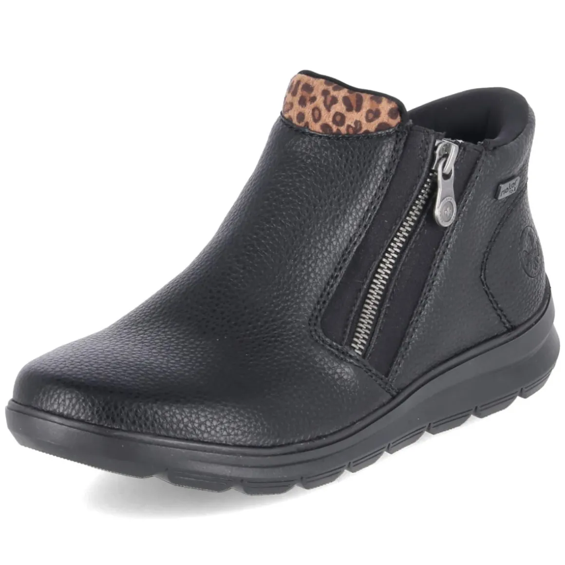 Die Rieker Damen-Stiefeletten verbinden Funktion und Komfort in einem stilvollen Auftritt. Das wasserfeste Obermaterial aus schwarzem Kunstleder schützt zuverlässig vor Nässe, während warmes Futter an kalten Tagen für Behaglichkeit sorgt. Der bequeme Reißverschlusseinstieg erleichtert das An- und Ausziehen, die runde Schuhspitze und der gepolsterte Einstieg erhöhen den Tragekomfort zusätzlich. Ein herausnehmbares, gepolstertes Fußbett mit textilem Decksohlenbezug ermöglicht individuelle Anpassung. Die verstärkte Ferse bietet Stabilität, die flexible, rutschfeste Profilsohle gibt sicheren Halt auf winterlichen Untergründen. Markanter Akzent: der Leopardmuster-Frontprint, der dem funktionalen Design eine modische Note verleiht. Größenhinweis: fällt normal aus. Modetipp: In Kombination mit schmaler Denim, Camel-Wollmantel und grobem Strickschal entsteht ein urbaner Winterlook, den Accessoires in Animal-Optik modern abrunden.