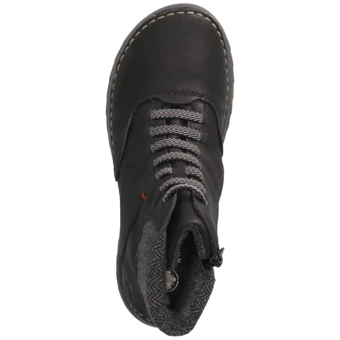 Diese Damen-Stiefeletten von Rieker vereinen lässige Optik mit praxisorientierten Details. Das modern designte Obermaterial aus Synthetik präsentiert sich in zeitlosem Schwarz und wird durch einen Schaftrand aus Textil mit feinem Fischgrätenmuster akzentuiert. Rustikale Ziernähte und dezente Markendetails unterstreichen den charaktervollen Look. Die runde Schuhspitze, ein verstärkter Zehen- und Fersenbereich sowie die flexible, rutschfeste Laufsohle sorgen für Komfort und Trittsicherheit, während die textile Decksohle und ein leichtes Futter an kühlen Tagen angenehm wärmen. Der seitliche Reißverschluss ermöglicht müheloses An- und Ausziehen. Der Schnitt fällt normal aus und passt sich Alltag wie Freizeit an. Modetipp: Besonders stimmig wirken die Stiefeletten zu Skinny-Jeans, grob gestricktem Cardigan und einem cleanen Wollmantel in Anthrazit.