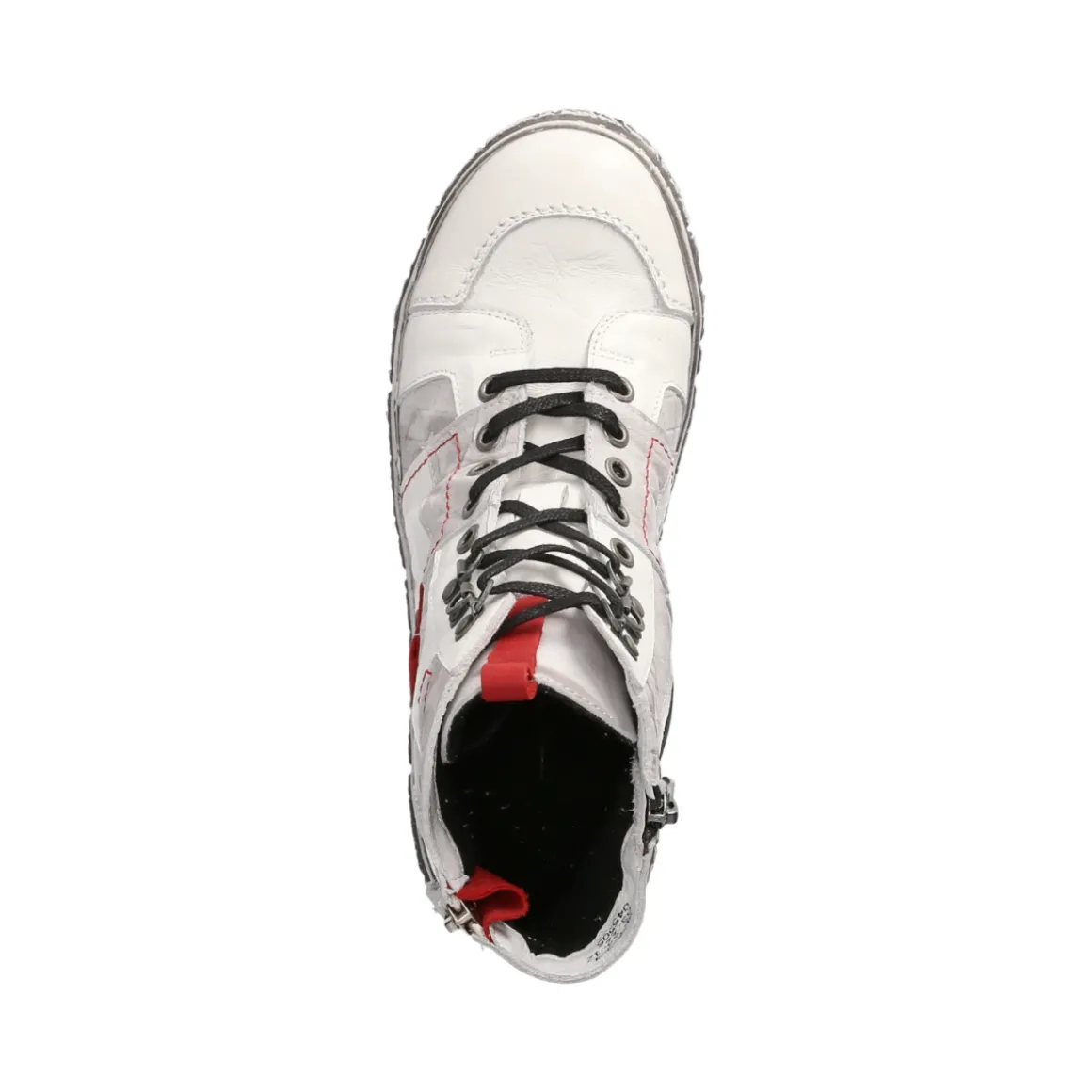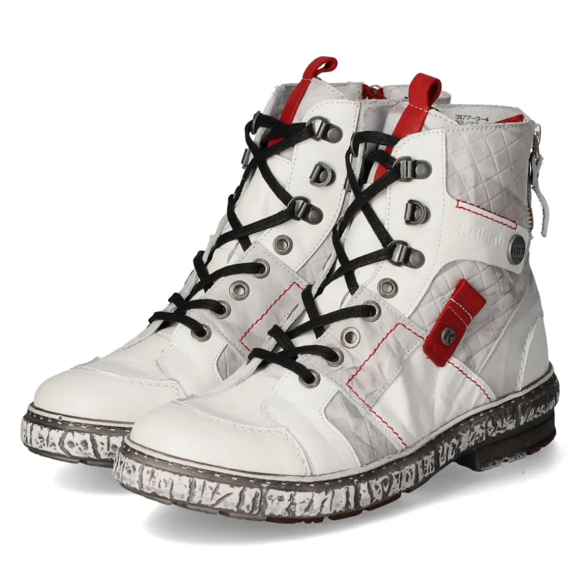 Diese weißen Stiefeletten von Krisbut verbinden urbanen Chic mit zuverlässigem Komfort. Langlebiges Echtleder in Glattleder-Qualität trifft auf eine flexible, griffige Laufsohle, die selbst auf glatten Wegen guten Halt bietet. Der 3 cm hohe Blockabsatz entlastet, ohne an Stabilität einzubüßen, während die runde Schuhspitze ein angenehmes Tragegefühl schafft. Der Mix aus Schnürsenkeln und bequemem Reißverschlußeinstieg erleichtert das An- und Ausziehen, die Decksohle aus Leder-Textil wirkt angenehm auf der Haut und das Wechselfußbett ermöglicht individuelle Anpassungen. Optische Akzente setzen Partien im Rautenmuster, modische Knautsch-Optik, Ziernähte, ein Zierreißverschluss am Schaft sowie der Used-Look am Sohlenrand. Das Modell fällt normal aus und passt vielseitig zum Alltag. Modetipp: Zu cropped Denim, einem beigen Trench und einer strukturierten Lederhandtasche entsteht ein cleaner City-Look mit subtiler Edge.