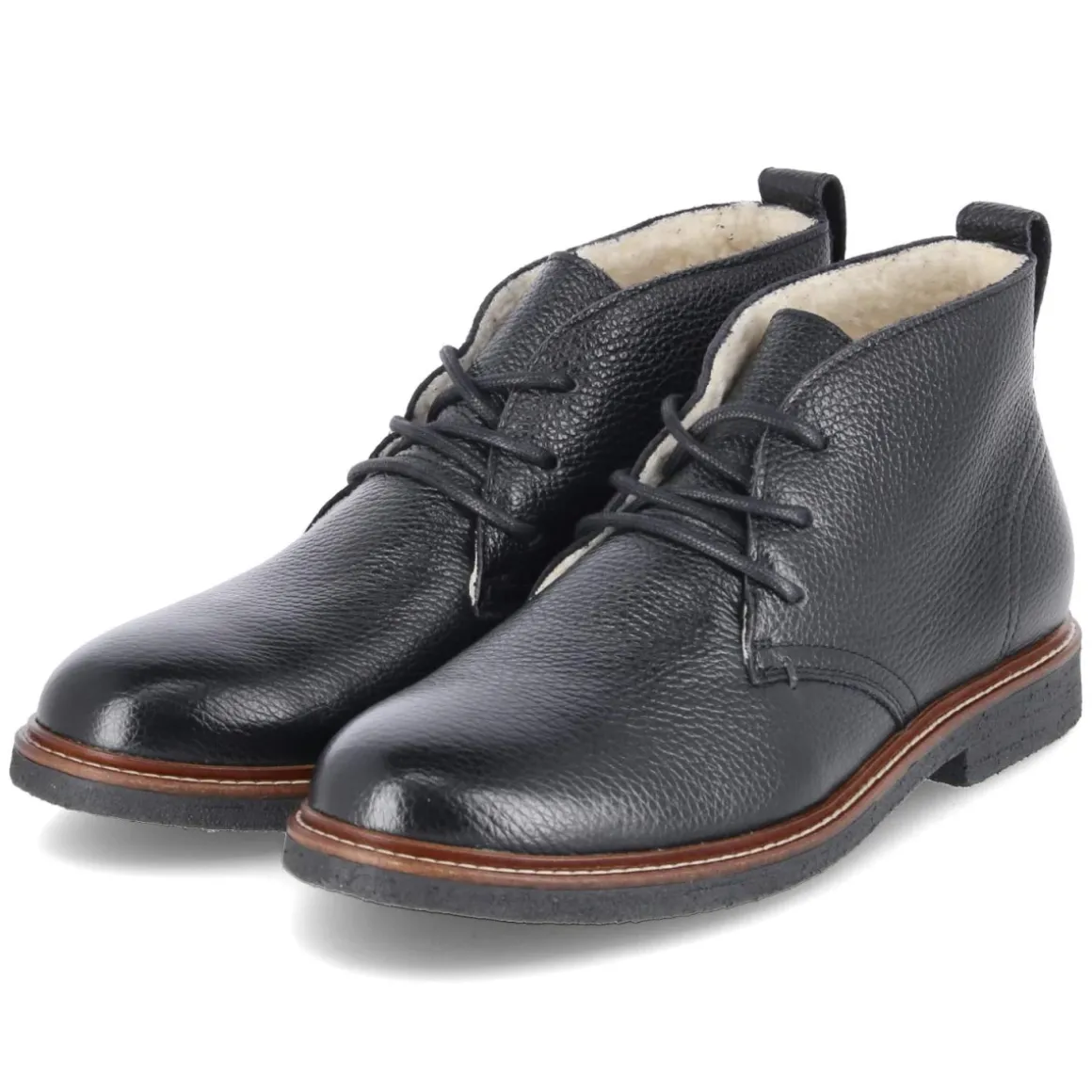Kaerlek präsentiert Winterboots, die Funktion und Stil souverän verbinden. Das Obermaterial aus robustem Glattleder zeigt sich in klassischem Schwarz und überzeugt mit langlebiger Haptik. Ein warmes Futter sorgt bei kalten Temperaturen für behagliches Klima, während die synthetische Decksohle pflegeleicht bleibt. Der 3 cm hohe Blockabsatz und die runde Spitze bieten stabilen Auftritt und entspanntes Tragegefühl im Alltag. Dank Schnürverschluss sitzt der Schuh sicher am Fuß, die Passform fällt normal aus. Praktisch zeigen sich der verstärkte Fersenbereich und die Anziehlasche, die den Einstieg erleichtern. Für zusätzlichen Halt auf winterlichen Wegen sorgt die flexible, rutschfeste Laufsohle. Das zeitlose Design macht die Boots zum vielseitigen Begleiter für Herren im urbanen Umfeld wie auf Landwegen. Modetipp: Besonders harmonisch wirkt der Look mit Raw-Denim, Wollmantel und grobem Strick in Naturtönen.