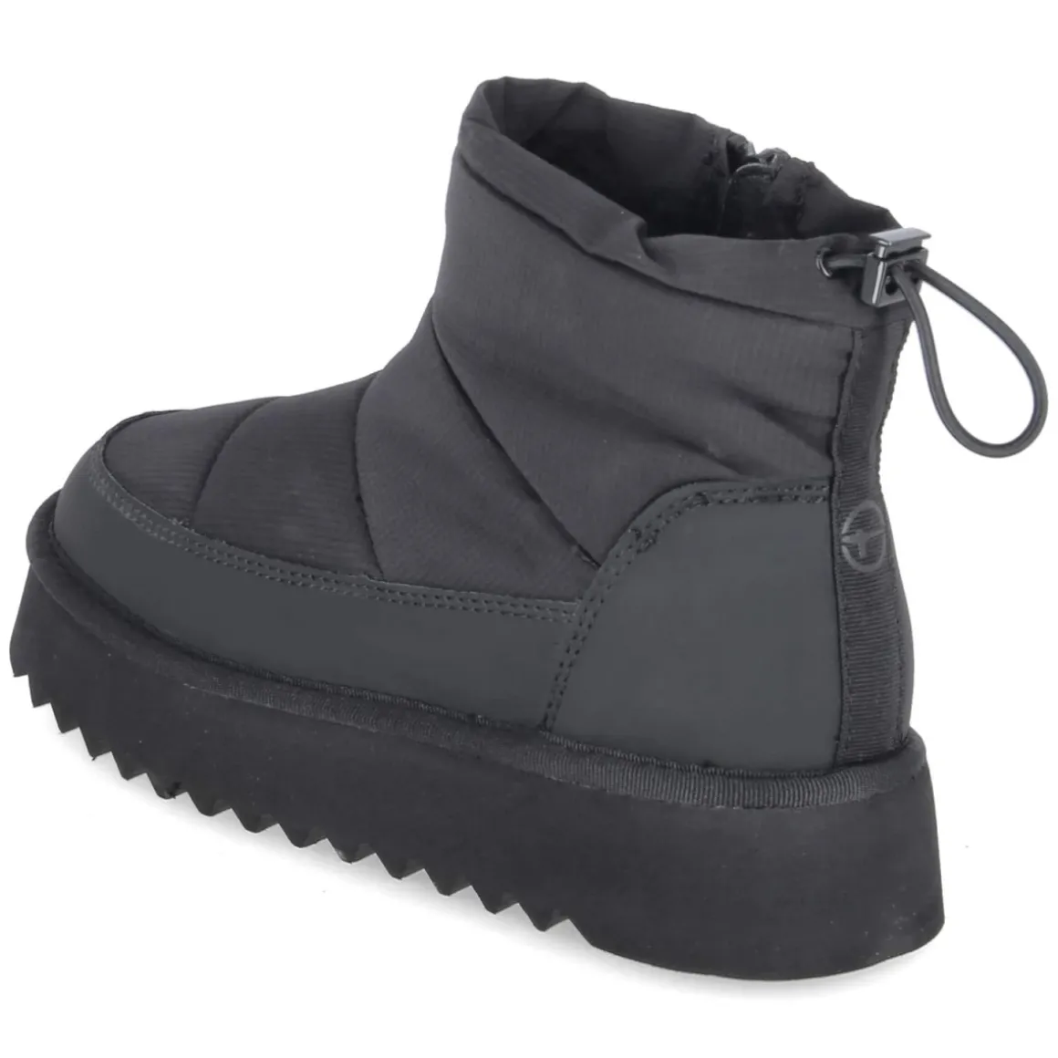 Die Tamaris Winterboots in Schwarz verbinden retroinspiriertes Snowboot-Design mit zeitgemäßem Komfort. Die matte Quersteppoberfläche trifft auf einen weichen Schaft mit Gummizug und Schnellverschluss, während der seitliche Reißverschluss ein müheloses Hineinschlüpfen ermöglicht. Warmfutter und eine textile Decksohle umhüllen den Fuß angenehm, der verstärkte Fußrahmen gibt Stabilität im Alltag. Die runde Spitze und das Obermaterial aus Textil und Synthetik sorgen für ein angenehmes Tragegefühl, die pflegeleichte Oberfläche erleichtert die Handhabung. Mit 3,5 cm Plateauhöhe und einer dicken, leichten Sohle entsteht ein moderner Look, der zugleich Schutz vor Bodenkälte bietet. Der Schnitt fällt normal aus und eignet sich für vielfältige Winter-Outfits. Modetipp: Mit Pufferjacke, gerippten Wollstrümpfen und verkürzter Straight-Leg-Jeans entsteht ein urbane Silhouette, die das voluminöse Schaftdesign souverän ausbalanciert.