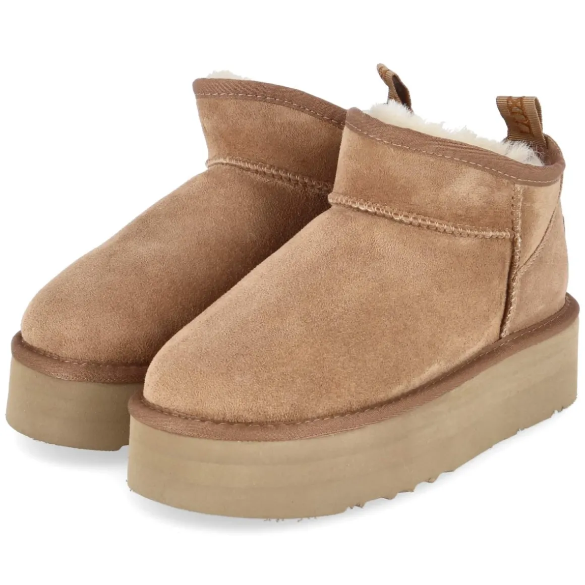 Die Winterboots COZY von Australia Luxe verbinden markantes Plateau mit behaglicher Wärme. Weiches Rauleder in Braun und das runde Leistenbild sorgen für eine zeitlose Silhouette, während das warme Lammfellfutter den Fuß umschließt und für wohlige Isolation steht. Die 4,5 cm hohe, starke und zugleich leichte Plateausohle federt jeden Schritt, die verstärkte Ferse mit Metall-Label unterstreicht die wertige Verarbeitung. Ohne Verschluss gelingt der Einstieg dank Anziehlasche besonders unkompliziert, die Passform fällt normal aus. Eine Decksohle aus Textil ergänzt den Komfort, markante Nähte akzentuieren das natives Design. Modetipp: Zu geripptem Strickkleid in Creme und Oversize-Wollmantel in Karamell tragen, dazu eine strukturierte Umhängetasche und grob gestrickte Socken, die dezent über dem Schaft sichtbar bleiben.