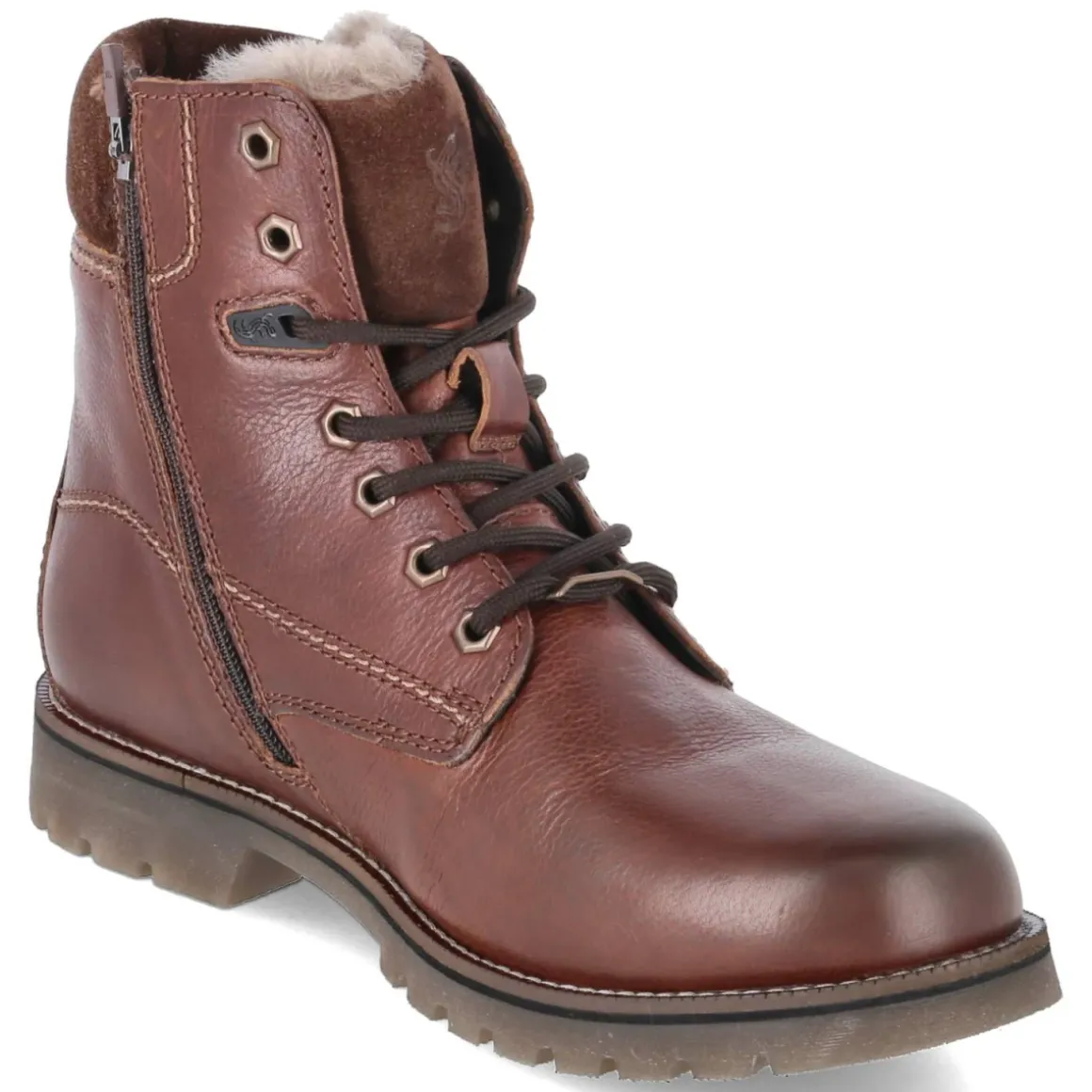 Der Winterboot von Salamander präsentiert sich als robustes Herrenmodell aus hochwertigem Echtleder in warmem Braun mit rustikalem Charakter. Das runde Leistenprofil gewährt komfortablen Zehenraum, während der gepolsterte Einstieg und die verstärkte Ferse für Stabilität auf längeren Wegen sorgen. Das Lammfellfutter hält zuverlässig warm, die Textil-Decksohle ergänzt den Tragekomfort. Ein 3,5 cm hoher Blockabsatz unterstützt einen sicheren Stand, die rutschfeste Profilsohle gibt Grip auf nassen und winterlichen Untergründen. Dank Schnürsenkeln lässt sich die Passform präzise regulieren, der seitliche Reißverschluss ermöglicht schnelles An- und Ausziehen. Der Größenhinweis fällt normal aus. Modetipp: Mit Raw-Denim, grobem Strickpullover und Parka entsteht ein authentischer Outdoor-Look, den ein Ledergürtel im ähnlichen Braunton harmonisch abrundet.