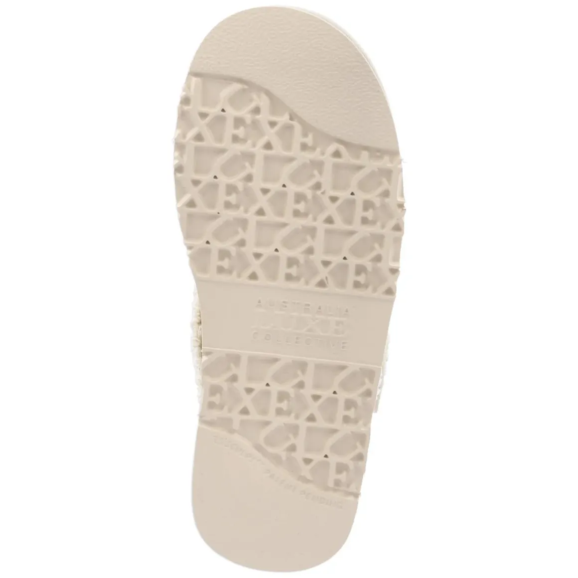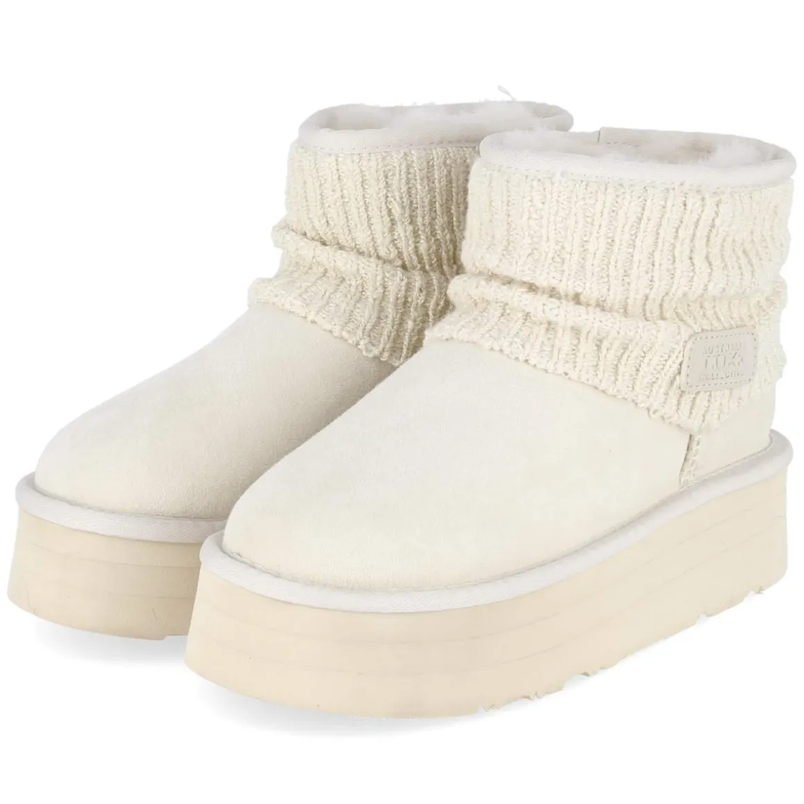 Winterboots FAME von Australia Luxe vereinen urbane Modernität mit kuscheliger Wärme. Das weiße Obermaterial aus Leder und Textil setzt mit markanten Nähten ein klares Statement, während das warme Lammfellfutter und die textile Decksohle für behaglichen Komfort sorgen. Die runde Spitze und der unkomplizierte Einstieg ohne Verschluss unterstreichen den lässigen Charakter, die verstärkte Ferse mit Metall-Label verleiht eine edle Note. Der gepolsterte Einstieg mit Umschlagkrempe in Strickoptik und Lederpatch schmiegt sich weich an, die leichte, starke Plateausohle mit 4,5 cm Höhe streckt subtil und bietet verlässlichen Grip. Fällt normal aus und überzeugt mit robustem Material-Mix und moderner Optik – ideal für kalte Tage in der City. Modetipp: Ton-in-Ton mit Creme, Grau und Weiß stylen, dazu chunky Socken leicht sichtbar, langer Wollmantel und silberne Akzente für einen klaren, winterlichen Look.