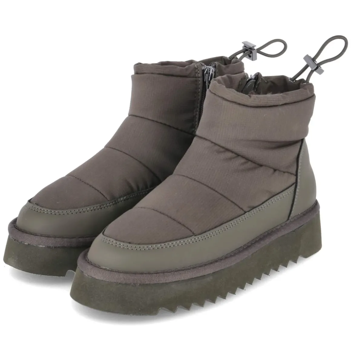 Diese Damen-Winterboots von Tamaris vereinen Retro-Snowboot-Charme mit moderner Funktion. Das dunkelgrüne (olive) Obermaterial aus Textil & Synthetik zeigt eine matte Quersteppoberfläche, die pflegeleicht ist und dem Look Struktur gibt. Ein weicher Schaft mit Gummizug und Schnellverschluss umschließt angenehm, während der bequeme Reißverschlusseinstieg das An- und Ausziehen erleichtert. Warmfutter und textile Decksohle sorgen für behagliche Wärme an kalten Tagen, das geringe Gewicht erhöht den Tragekomfort. Die runde Spitze und der verstärkte Fußrahmen ergänzen das robuste Design. Die dicke Sohle mit 3,5 cm Plateau verleiht eine sanfte Höhe und stabilen Stand. Der Schnitt fällt normal aus – ideal für den gewohnten Größengriff. Modetipp: Ton-in-Ton mit Steppmantel in Khaki und grob gestrickten Leggings kombinieren; dazu eine Beanie in Creme für einen harmonischen Winter-Look.