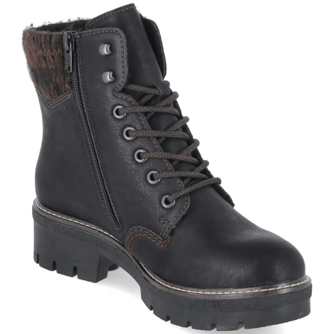 Der Winter kann kommen: Die Rieker Winterboots für Damen kombinieren funktionale Stärke mit stilvollem Auftritt. Schwarzes Kunstleder mit dezenten Ziernähten und einer gemütlichen Strickkrempe umrahmt den Schaft, während warmes Futter und ein gepolstertes, herausnehmbares Fußbett für wohligen Komfort sorgen. Das wasserfeste, wasserabweisende Obermaterial schützt zuverlässig bei nassem Wetter, die rutschfeste, kräftig profilierte Sohle gibt Halt auf glatten Wegen. Schnürung und zusätzlicher Reißverschluss ermöglichen eine individuell anliegende Passform und bequemes An- und Ausziehen. Der 4 cm hohe Blockabsatz stabilisiert, die runde Spitze bietet Zehenfreiheit. Die Passform fällt normal aus und trifft damit den Alltagsbedarf von Erwachsenen, die Wert auf Wärme, Leichtigkeit und Eleganz legen. Modetipp: Mit slim geschnittener Jeans, Grobstrickpullover und einem Wollmantel in Kamel setzt der Boot einen urbanen Akzent.