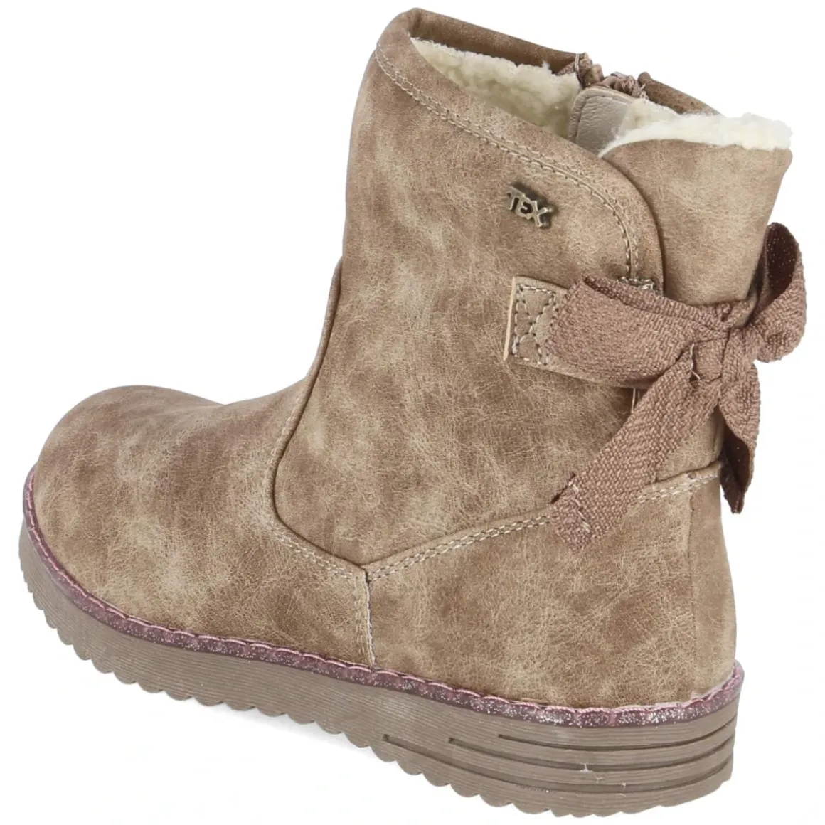 Der Winterboot von Indigo vereint kindgerechten Komfort mit funktionalen Details für kalte Tage. Das braune Obermaterial aus Textil und Synthetik ist wasserfest und zugleich atmungsaktiv, während ein warmes Teddyfutter für wohlige Wärme sorgt. Eine textile Decksohle schmiegt sich angenehm an, die runde Schuhspitze bietet Zehenfreiheit. Dank Reißverschluss gelingt das An- und Ausziehen im Schulalltag mühelos. Ein verstärkter Fersenbereich und ein flexibles Fersenpolster unterstützen wachsende Füße, die flexible, griffige Laufsohle gibt Halt auf nassem Asphalt und winterlichen Wegen. Liebevolle Akzente setzen der rosa glitzernde Sohlenrahmen und die textile Schleife am hinteren Schaft. Das Modell fällt normal aus und passt zuverlässig zu den Größen von Grundschulkindern. Modetipp: Mit Thermojeans, einem Wollparka und einer Mütze in Rosé wird der Glitzerrahmen elegant aufgegriffen, ohne den robusten Charakter zu verlieren.