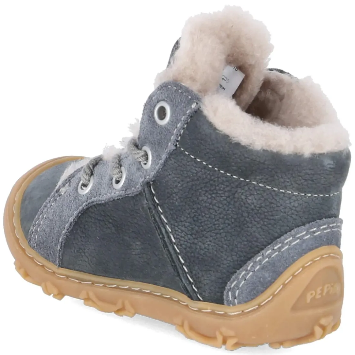 Mit den Winterschuhen ELIA von Pepino sind Kleinkinder bereit für kalte Tage. Das Obermaterial aus robustem Rauleder in zeitlosem Blau und die Decksohle aus Leder sorgen für angenehmes Tragegefühl mit Wohlfühlfaktor. Im Inneren hält ein wärmendes Lammfellfutter kleine Füße zuverlässig warm, ohne aufzutragen. Die flexible, rutschfeste Barefoot-Laufsohle mit Zehenkappe unterstützt natürliche Bewegungen und gibt auf glatten Wegen sicheren Halt, während der verstärkte Fersenbereich Stabilität bietet. Die runde Schuhspitze und der Schnürverschluss ermöglichen eine bequeme Passform; der Größenhinweis fällt normal aus. So wird der Winterspaziergang vom Spielplatz bis zur Stadt zum Vergnügen. Modetipp: Zu Strickmütze, wolliger Strumpfhose und einer gefütterten Cordhose entsteht ein kuscheliger Look, der Farbe und Funktion stilvoll verbindet.