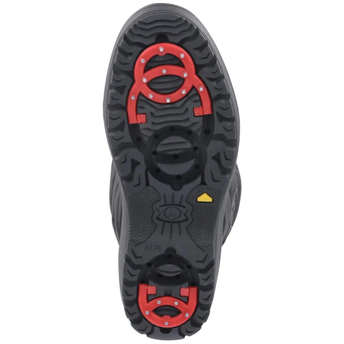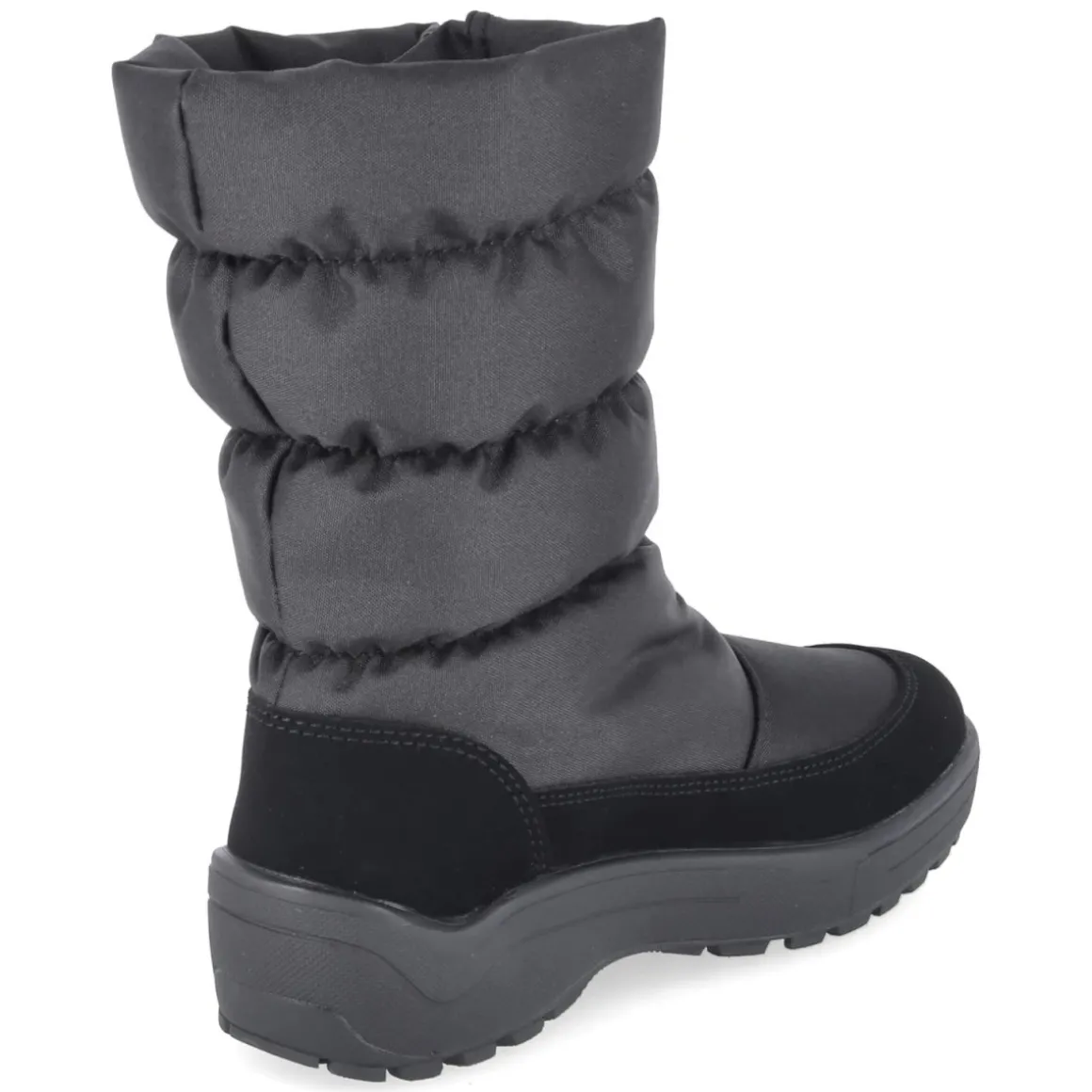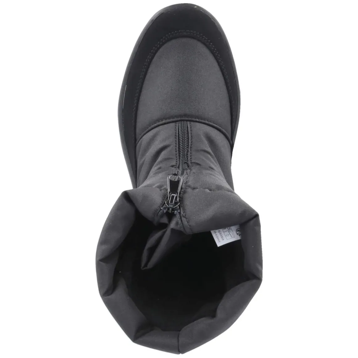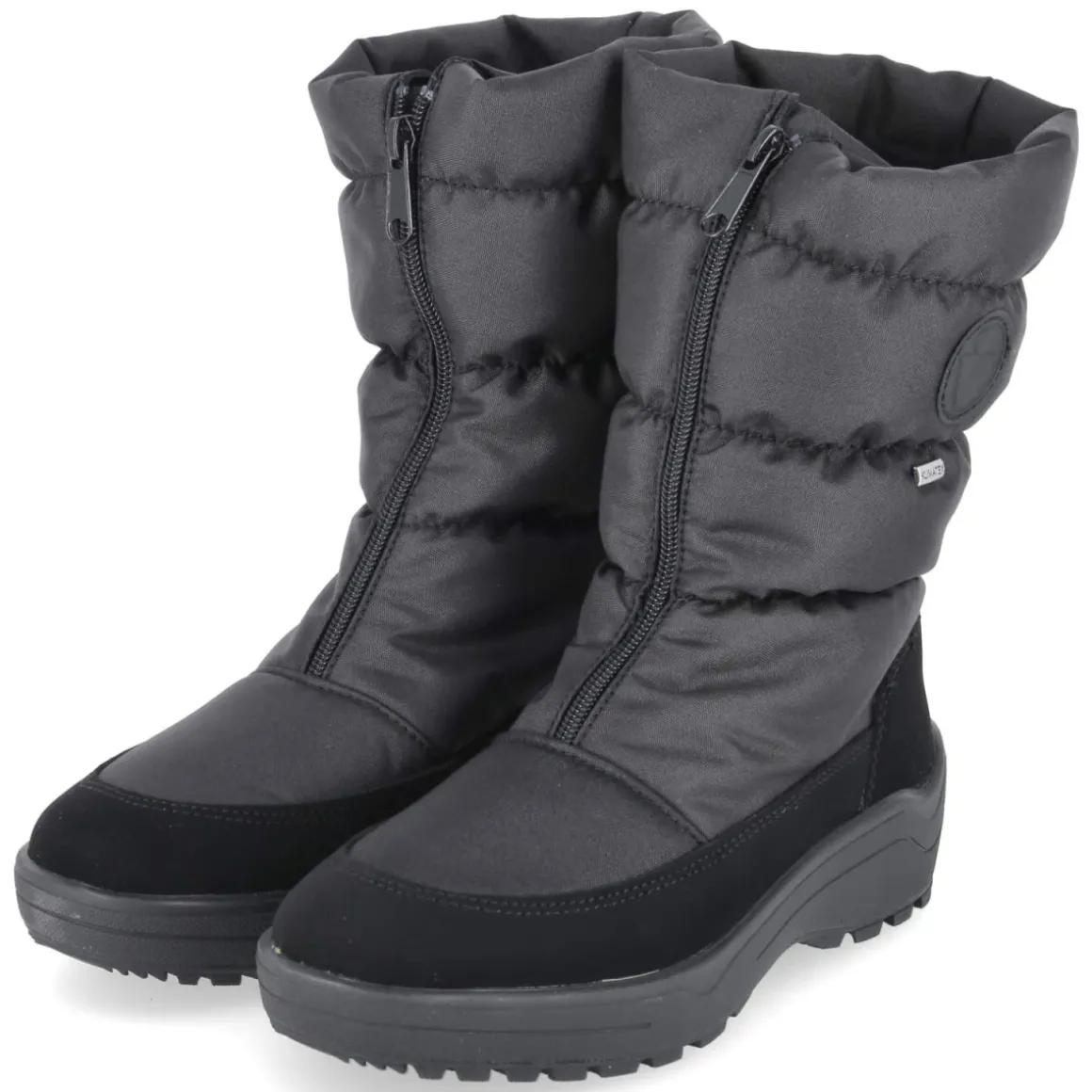 Der Vista Winterstiefel in Schwarz verbindet funktionale Sicherheit mit zeitlosem Design. Das wasserabweisende, wasserfeste Textil-Obermaterial hält Nässe zuverlässig ab, während Warmfutter und textile Decksohle ein behagliches Klima schaffen. Der weiche Klimatex-Schaft mit Quersteppung schmiegt sich angenehm an, Schaftmaß ca. 22 cm Höhe und 30 cm Umfang. Für Grip auf vereisten Wegen sorgt das OC-System mit ausklappbaren Spikes in der Profilsohle, unterstützt von einem verstärkten Fußrahmen. Ein praktischer Reißverschluss ermöglicht bequemes An- und Ausziehen, die runde Spitze bietet Zehenfreiheit. Der Stiefel fällt normal aus und ist damit unkompliziert in der Größenauswahl. Modetipp: Mit Strickkleid, dicker Strumpfhose und langem Wollmantel entsteht ein eleganter Winterlook, der Wärme und Stil vereint.