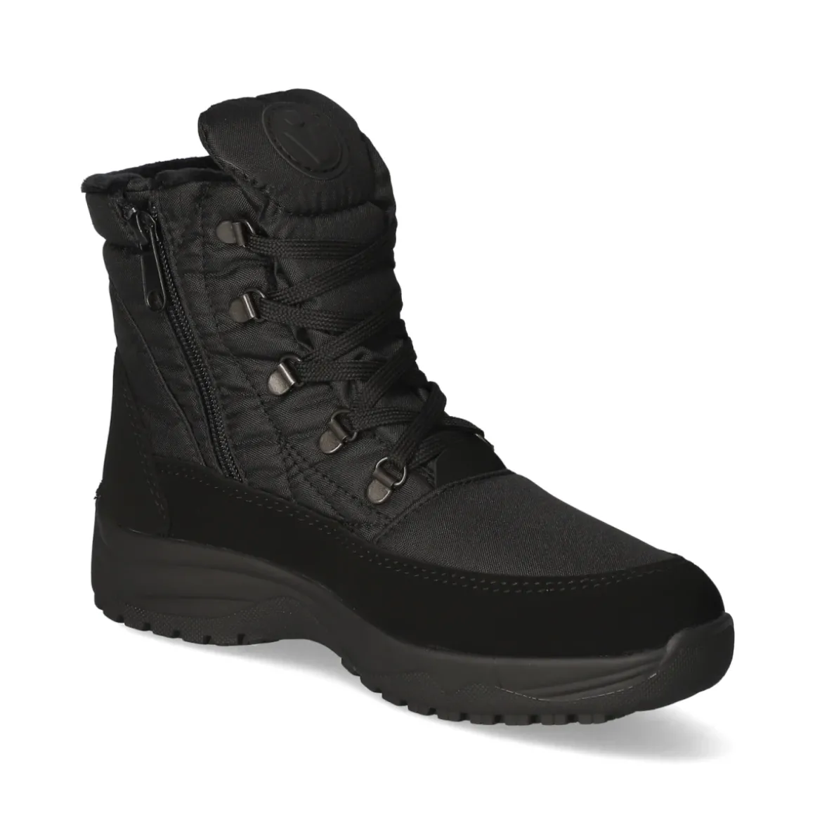 Die Winterstiefeletten von Vista in klassischem Schwarz kombinieren wetterfesten Schutz mit hohem Komfort. Das robuste Obermaterial aus Textil und die wasserabweisende, atmungsaktive Ausstattung sichern ein angenehmes Fußklima, während das weiche Warmfutter zuverlässig wärmt. Schnürung und Reißverschlusseinstieg sorgen zusammen für passgenauen Halt und schnellen Einstieg. Die runde Schuhspitze schenkt Zehenfreiheit, der gepolsterte Schaft entlastet den Knöchel. Für maximale Trittsicherheit auf Eis und Schnee steht die flexible OC-System-Profilsohle mit ausklappbaren Spikes bereit; rutschhemmend bei Glätte und komfortabel im Alltag. Die gepolsterte, herausnehmbare Wechseldecksohle bietet weiche Dämpfung und lässt sich bei Bedarf gegen eigene Einlagen tauschen. Modetipp: Zu einer verkürzten Wollhose und einer voluminösen Steppjacke entsteht ein cleaner, sportiver Winterlook.