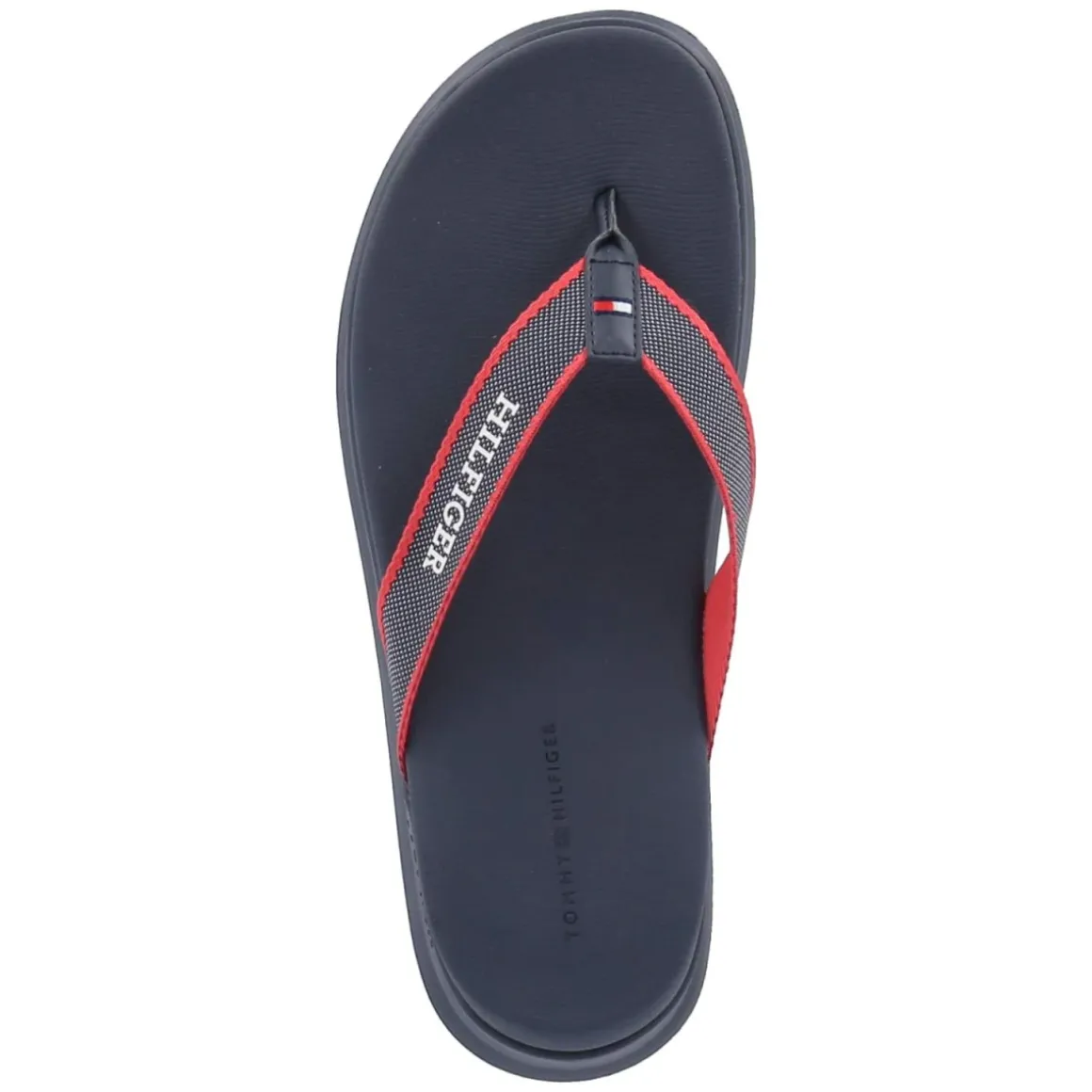 Der Zehentrenner DUAL DENSITY TOE von Tommy Hilfiger verbindet sommerliche Leichtigkeit mit markentypischer Aussage. Das robuste Textilobermaterial in Blau sorgt für Stabilität, während der Riemen mit rotem Rand und prägnantem Markenschriftzug den ikonischen Look unterstreicht. Ein weich gepolstertes, synthetisches Fußbett bietet angenehme Dämpfung beim Gehen, die flexible, griffige Laufsohle mit leichtem Profil gibt verlässlichen Halt auf warmen Stadtpflastern wie auf Strandpromenaden. Die offene Schuhspitze und das unkomplizierte Hineinschlüpfen machen den Herren-Zehentrenner zum unkomplizierten Begleiter. Passformhinweis: fällt normal aus. Modetipp: Für einen klaren Sommerlook mit navyfarbenen Badeshorts, weißem Jersey-Tank und einer leichten Overshirt-Jacke kombinieren; eine Cap in Rot greift den Riemenrand auf.