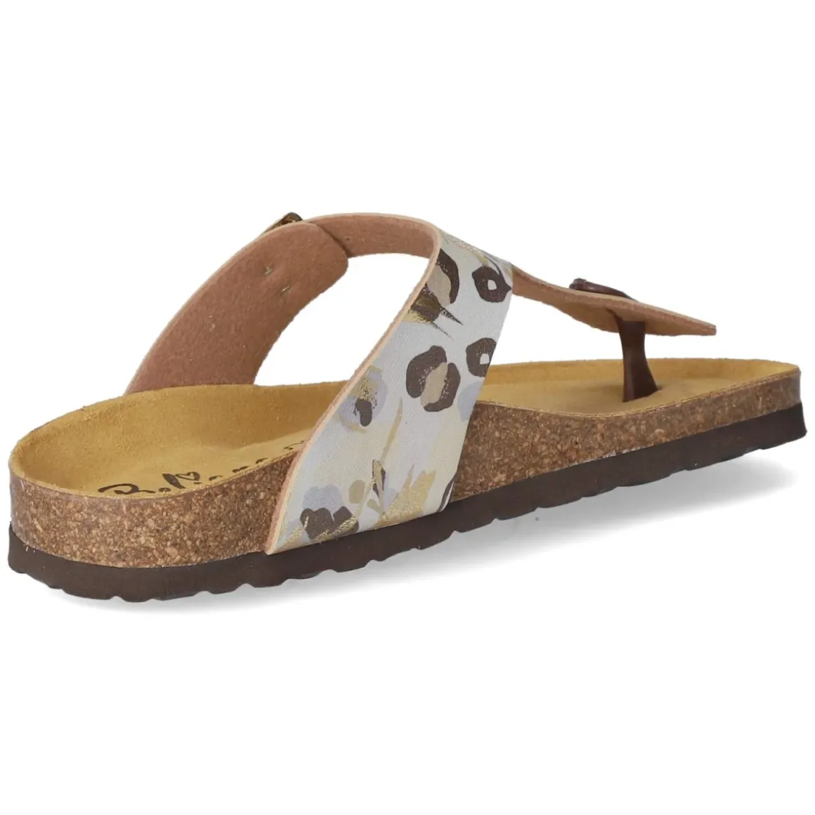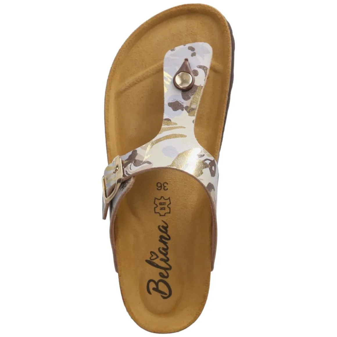 Der gemusterte Zehentrenner von Beliana verbindet sommerliche Leichtigkeit mit komfortabler Ausstattung. Die abstrakte, mehrfarbige Musterung setzt einen lebhaften Akzent, während die goldene Schnalle einen eleganten Glanzpunkt bildet. Das Obermaterial aus Kunstleder überzeugt mit pflegeleichter Oberfläche, die sich unkompliziert reinigen lässt. Für langanhaltenden Komfort sorgt die vorgeformte, gepolsterte Lederdecksohle, die gemeinsam mit der flexiblen Laufsohle ein angenehm weiches Auftreten ermöglicht. Der offene Schnitt und der unkomplizierte Einstieg unterstreichen die entspannte Note, der verstellbare Verschluss bietet dabei zuverlässigen Halt. Die Passform fällt normal aus und eignet sich für den täglichen Einsatz in der warmen Saison. Modetipp: Zur Betonung des Farbspiels harmonieren luftige Leinenhosen und ein unifarbenes Top; goldfarbener Schmuck greift die Schnalle stilvoll auf.