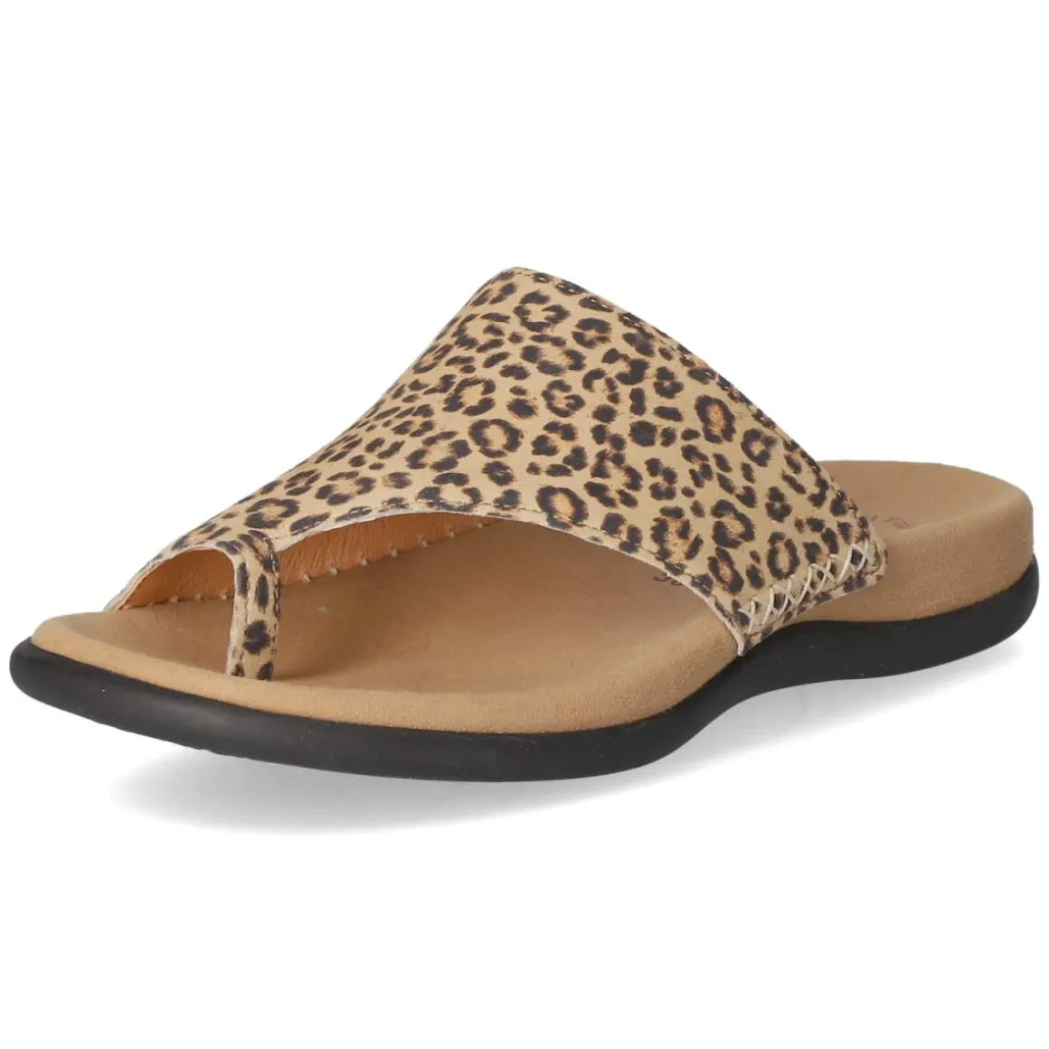 Der Gabor Zehentrenner verbindet sommerliche Leichtigkeit mit Komfort. Das Obermaterial aus weichem Rauleder zeigt sich in Beige und erhält durch ein markantes Animal Print-Detail modische Raffinesse. Atmungsaktives Echtleder sorgt für ein ausgeglichenes Fußklima, während die textile Decksohle in Kombination mit dem gepolsterten Fußbett den ganzen Tag über sanften Halt und angenehme Dämpfung bietet. Die offene Schuhspitze und der unkomplizierte Einstieg unterstreichen die entspannte Silhouette und machen den Slip-on zum unkomplizierten Begleiter im Alltag wie im Urlaub. Dank größengetreuem Sitz lässt sich das Modell verlässlich einplanen. Modetipp: Zum fließenden Midikleid in Naturtönen und einer Korbtasche kombinieren, dazu feiner Goldschmuck – so kommt der Animal Print als edler Akzent perfekt zur Geltung.