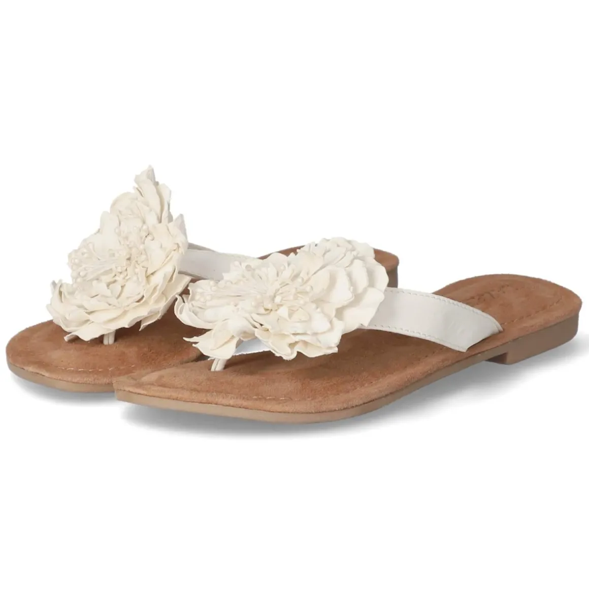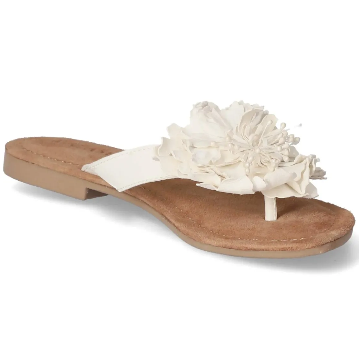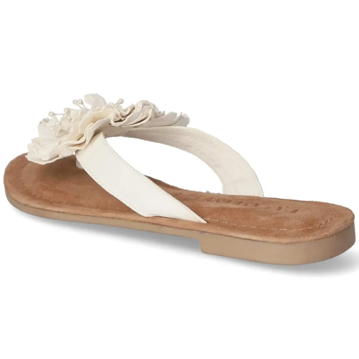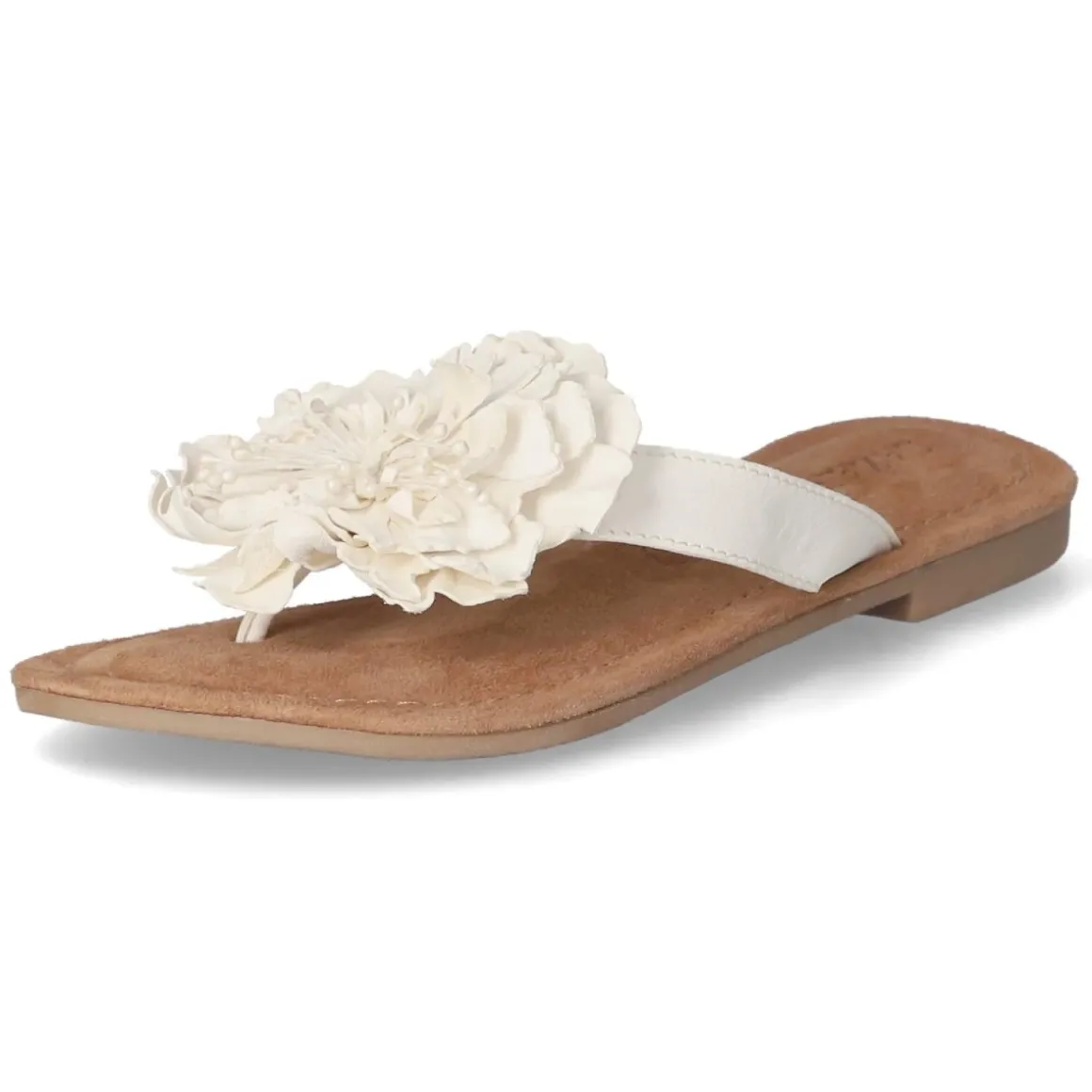 Der LAZAMANI Zehentrenner in strahlendem Weiß verbindet festliches Design mit sommerlicher Leichtigkeit. Das Obermaterial aus hochwertigem Glattleder und eine atmungsaktive Decksohle aus Echtleder sorgen für ein angenehmes Fußklima, während das gepolsterte Lederfußbett sanft dämpft. Die offene Schuhspitze unterstreicht die luftige Silhouette, die große, fein gearbeitete Blume am Zehenbereich setzt einen eleganten Akzent. Dank flexibler, griffiger Laufsohle bietet das Modell zuverlässigen Halt auf unterschiedlichsten Untergründen, ganz ohne Verschluss und im Handumdrehen angezogen. Die Passform fällt normal aus und eignet sich damit ideal für vielfältige Anlässe von Gartenparty bis Sommerhochzeit. Modetipp: Zu einem fließenden Midikleid in Pastelltönen und zarten Perlmutt-Accessoires getragen, entfaltet der weiße Zehentrenner seine festliche Ausstrahlung besonders stilvoll.