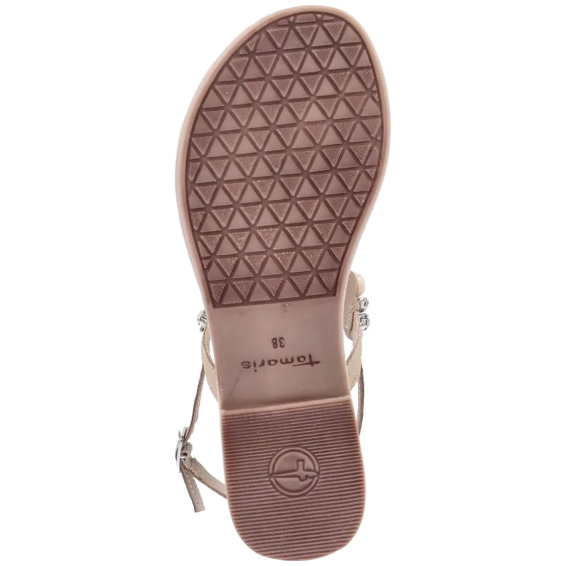 Diese Zehentrenner-Sandalen von Tamaris verbinden einen glamourösen Look mit alltagstauglichem Komfort. Zierende Schmucksteine fangen das Licht ein und verleihen dem beige gehaltenen Design eine elegante Note, die zu City-Styles ebenso passt wie zu sommerlichen Anlässen. Das Obermaterial aus Leder und Textil schmiegt sich angenehm an, während die lederne Decksohle und das gepolsterte Fußbett sanfte Dämpfung bei jedem Schritt bieten. Eine praktische Schnalle sorgt für individuell einstellbaren Halt, die offene Form lässt Luft an den Fuß. Die flexible, rutschhemmende Laufsohle mit leichtem Profil unterstützt sicheren Tritt auf glatten Wegen. Der Größenhinweis fällt normal aus und erleichtert die Wahl. Ein Modell für Damen, das Komfort und Strahlkraft mühelos vereint. Modetipp: Zu einem fließenden Maxikleid in Naturtönen und feinem Goldschmuck entfaltet das Schmuckstein-Detail seine volle Wirkung, ergänzt durch eine Korbtasche.