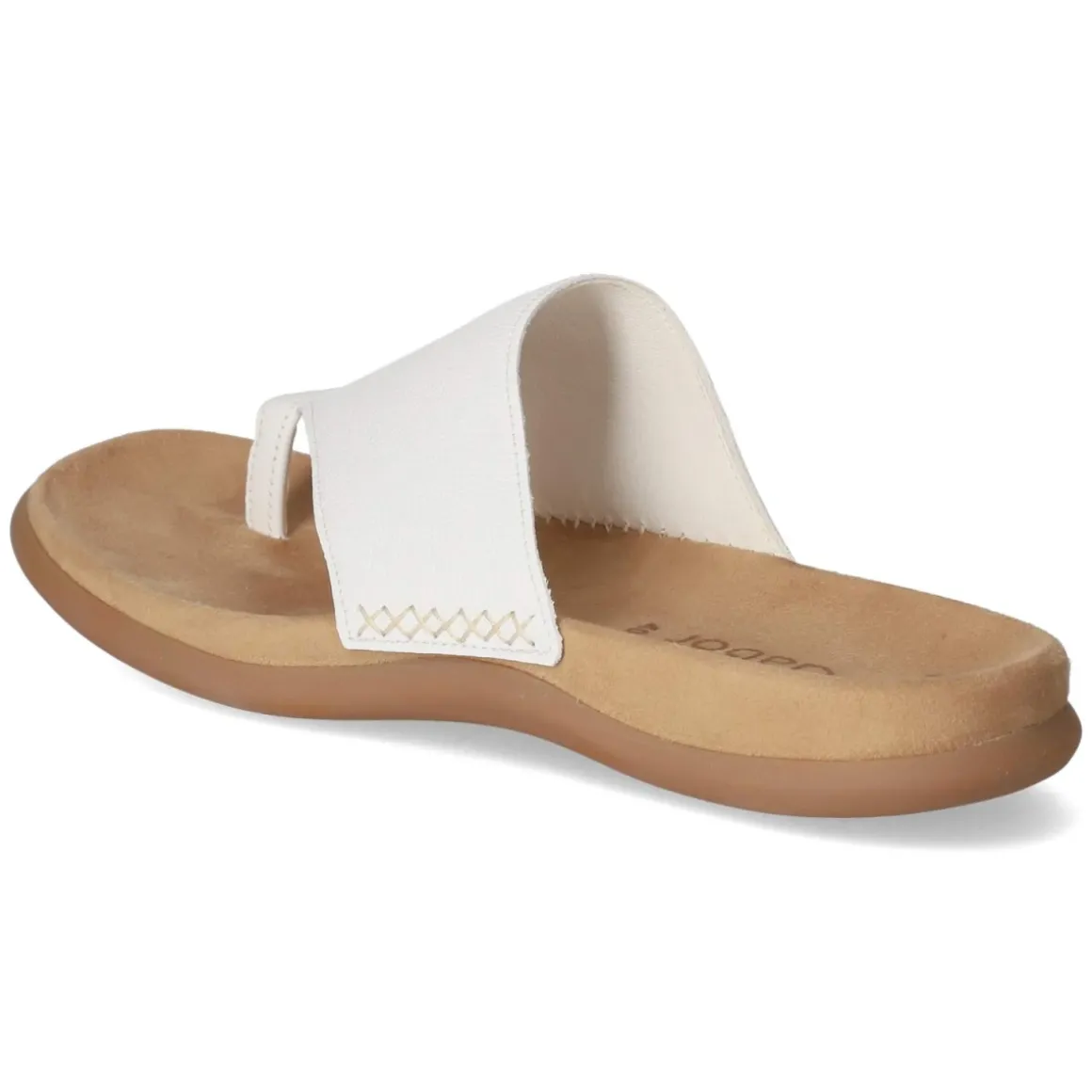Gabor präsentiert einen puristischen Zehentrenner in zeitlosem Weiß, der mit reduziertem Design und durchdachter Funktion überzeugt. Das Obermaterial aus langlebigem Echtleder in glatter Ausführung fühlt sich angenehm an und gewinnt mit jedem Tragen an Charakter. Eine vorgeformte Decksohle aus Textil und das dämpfende Fußbett sorgen für entspannten Komfort, während die flexible Laufsohle mit Grip sicheren Halt bietet. Die offene Schuhspitze unterstreicht den luftigen Look, die verschlusslose Konstruktion ermöglicht unkompliziertes Hineinschlüpfen. Ein seitlich gesetzter, zierender Kreuzstich verleiht feine Handwerks-Note. Dank normaler Passform fällt das Modell größengetreu aus und bietet vielseitige Kombinationsmöglichkeiten von Freizeit bis City. Modetipp: Besonders stimmig zu Leinenhosen, einem schlichten Hemdkleid oder Denim-Shorts; eine Korbtasche und filigraner Schmuck runden den Look sommerlich ab.