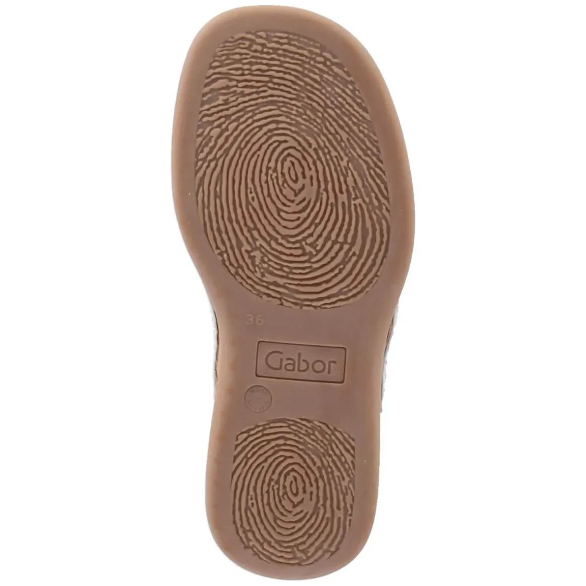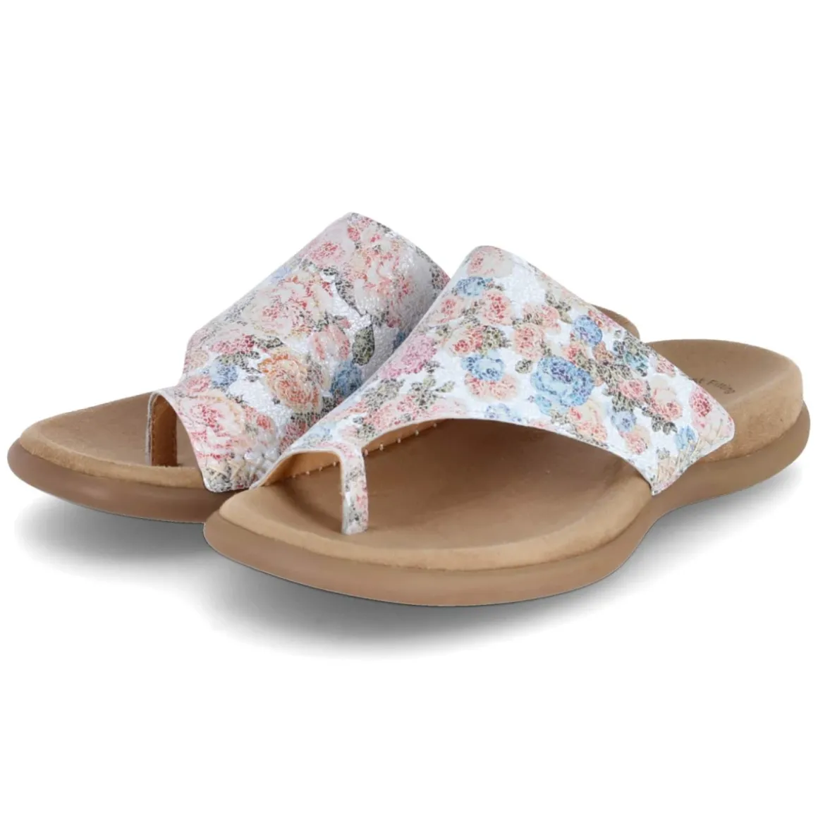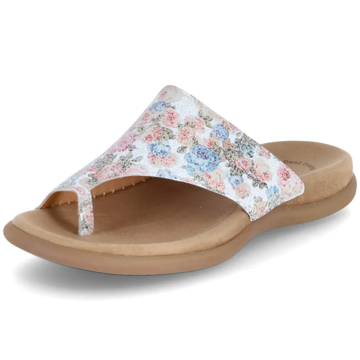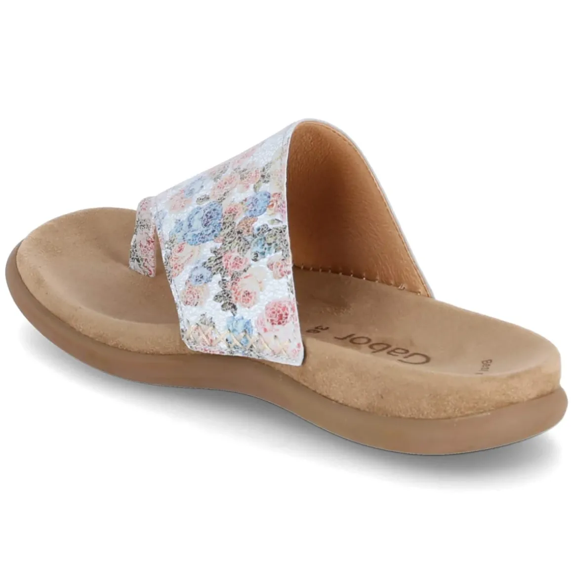 Dieser Zehentrenner von Gabor vereint sommerliche Leichtigkeit mit hochwertiger Verarbeitung. Das glatte Obermaterial aus langlebigem Echtleder präsentiert sich in klassischem Weiß, veredelt durch einen bunten Blumenprint, der die trendige Retro-Optik stilsicher unterstreicht. Die offene Schuhspitze und das Design ohne Verschluss sorgen für unkompliziertes Hineinschlüpfen. Innen punktet eine Textil-Decksohle, während das vorgeformte, weiche Fußbett den Fuß angenehm stützt. Die flexible, griffige Laufsohle bietet Halt auf verschiedensten Untergründen. Mit normaler Passform eignet sich das Modell hervorragend für den Alltag wie für den Strandspaziergang. Modetipp: Zu einem luftigen Leinenkleid in Naturtönen und einer Flecht-Tote entfaltet der florale Print seine volle Wirkung.